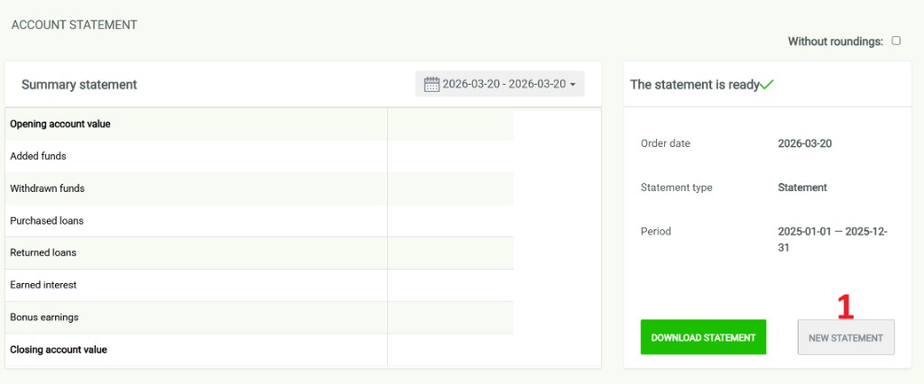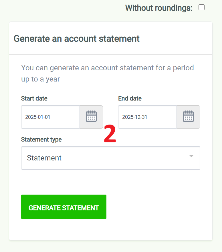 Ustaw zakres 1 stycznia – 31 grudnia, typ Statement, potem kliknij „GENERATE STATEMENT”.