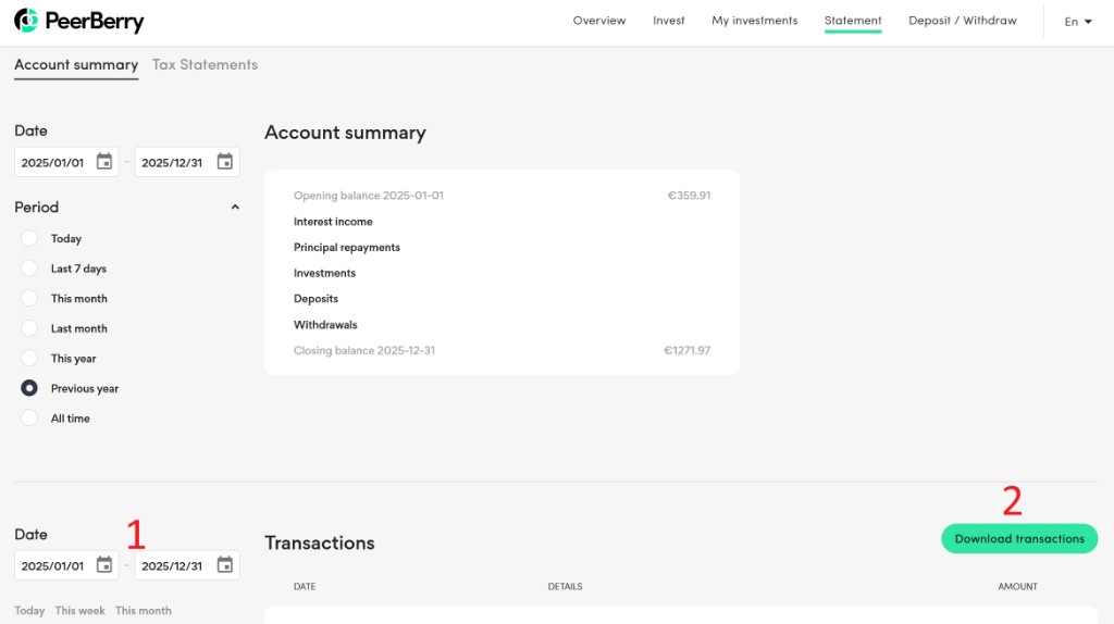 W sekcji Transactions ustaw daty na cały rok podatkowy (np. 1 stycznia – 31 grudnia) albo wybierz „Previous year”.