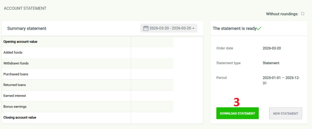 Ustaw zakres 1 stycznia – 31 grudnia, typ Statement, potem kliknij „GENERATE STATEMENT”.