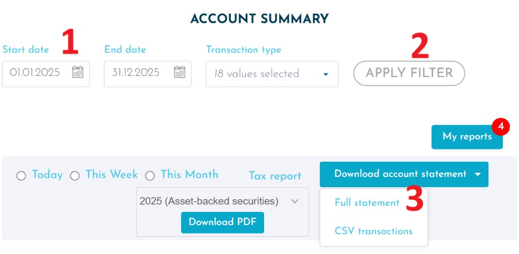 Ustaw filtry dat na cały rok podatkowy, a następnie pobierz listę transakcji jako plik CSV (Account summary / transactions export — zgodnie z widokiem na platformie).